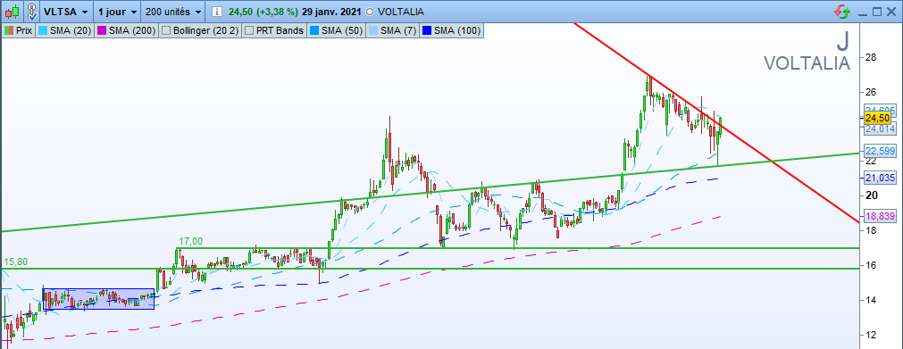 Graphiquement c’est très propre, elle a décollé à partir de décembre (lorsqu’elle a réalisé son Green Line Breakout). Détecté en janvier, il était pour moi, assez difficile de rentrer à ce moment. Suite à la consolidation des derniers jours, elle semble s’être stabilisée autour des 18€ ainsi que sur son support oblique.